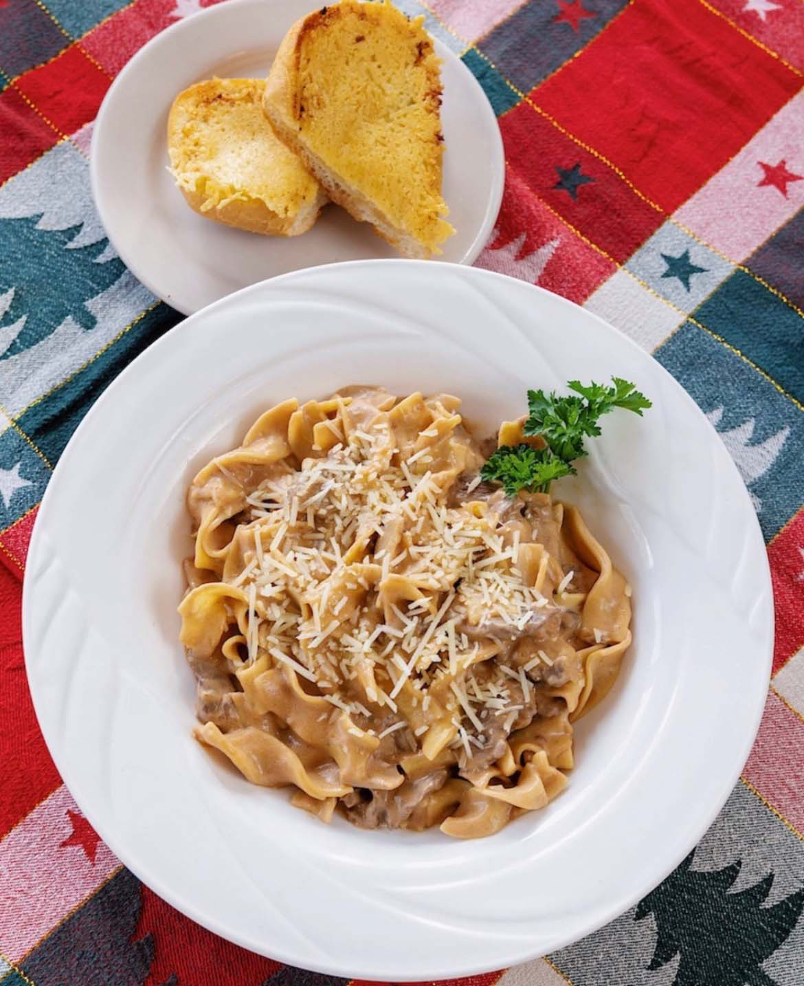 Thinly sliced Prime Top Sirloin in rich a sour cream sauce, with onion and mushrooms, served over egg noodles. Served with a side dinner salad and garlic toast. Get it a la carte 15